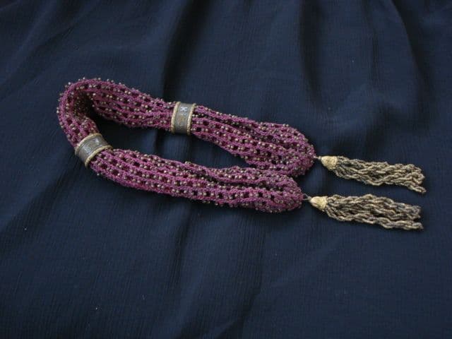 This is a great example of the Miser's Purse. Many names are used to describe purses of this type including the ring purse, stocking purse, long purse and string purse; all which are self-explanatory! For nearly 150 years Purses like this have been used - from around the 1780's in the18th Century until the 20th Century. Apparently as late as 1925 patterns for making them were still appearing in popular magazines . They are a clever invention which allowed coins to be safely stored at each end of the purse. The coins would be retained and accessed by simply sliding a ring along the item. Miser's purses were designed for both gentlemen and ladies to use. The purse could be suspended over a belt. I think this one dates from just before the Victorian period say 1800 to 1830, however it could be later as this is only a guess based on some photos in one of my reference books! It also looks more like the ones that were made in France so could well be continental. The book tells me that earlier English examples were larger in size, I guess the Cartwheel Penny that would have been currency in Georgian England would have needed a big purse! I think that French coinage from this time was smaller so that could well fit the estimated date and place of creation for this particular item!This lovely example has been lovingly hand-made. It has a burgundy red hand-knitted, or maybe even crocheted or netted, body with beadwork. The beads look a lot like cut steel beads but appear to be made from brass rather than cut steel. The same beads are used to make two plaited tassles to decorate each end of the purse. It has two rings (one appears to be oval in shape, whether it has got slightly squashed over time or whether it started out as an oval I don't know!) the rings are brass with gilding to the edges.The tassles dangle from two gilded decorative cups. This Misers Purse measures 11 ins by 2ins (28cms x 5cms) on the beaded crimson red part with tassles of approx 2 inches (5cms) at each end. The apperture for inserting the coins is 4 inches long. It is a joy to find something of over 150 years old in such a great condition,it is in really good order with no holes or damage, but I guess the colour will have dulled over the years from a vibrant crimson red to the burgundy red it is now. Perfect for collectors of early bags and purses, or people who love beadwork and unusual items from the past.