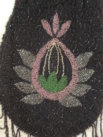 This is a really lovely example of beadwork from the first quarter of the 20th Century. This bag has been handmade from real silk satin with a netted beadwork overlay. Dating from between 1910 to the mid 1920's the bag has a pretty design of a kind of stylised fruit or flower surrounded by a leaf like pattern. The whole design is in tiny pink beads with grey, green and yellow beads on a black patterned background with looped bugle beading for a tassle. A pink and black border pattern has been worked around the top of the bag and over the handle. This evening purse is in a Dorothy Bag style with an elasticated drawstring to pull up the top of the purse. The condition of the bag is excellent with all beads present and no rips or stains. It would be possible to use the bag with great care. It is a good size, being just over 17 inches from the top of the handle to the bottom of the tassle loops with 6.5 inches in width. (44cms x16.5cms) This would be an excellent item to use for interior decoration or to add to a collection of beadwork bags.
