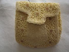 Here we have a little cream evening purse from the Art Deco era. It is in excellent condition throughout. It is lined in satin type fabric, with a mirror pocket complete with its original covered mirror. It has a little label 'Hand Made in Belgium' . Many of the gorgeous hand beaded evening puses from the Art Deco era were made in continental Europe, most usually France and Belgium. The beads on this one include some bronze colour faux pearls, used like little flowers, and masses of cream glass seed beads making a panel at the front and with a more swirly random design all over. The reverse of the purse has a swirly design all over. It also has a little beaded handle, suitable to place your hand through or thread through a sash. The purse closes with a flap-over lid and a press stud fastener. The colour and condition of this little beadwork purse would make it ideal as 'something old' for a bride!