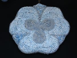 This little beaded purse in shades of blue and grey is the shape of a pansy flower with a trefoil design on it. It is handbeaded over both sides with lots of tiny round and bugle beads making up the design. It has a ball chain with a beaded ball for its handle and it fastens with a sliding ring and two press studs. Inside is a cream colour fabric but there are quite a few watermark type stains which show as brown marks on the lining. This is a sweet little purse from the 1920s to 1930s and would be lovely in a collection of vintage beaded bags and purses. Because of its tiny size it would also fit well into a miniature collection or would be great for the wardrobe of a treasured antique doll. It Is approximately 4 ins( 10cms) in diameter suspended from a double 5 inch (13cms) long chain handle.