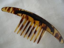 This is a most interesting comb because of both its shape and the decorative panel along the top. Made of celluloid, this hair accessory has a black and gold effect design. The panel appears to have been inlaid into the comb and looks a little like Toledo work. It depicts a gold winged dragon in the centre surrounded by foliage dotted with a few flowers within a gilded border. The comb itself is mottled brown and honey coloured just like real tortoiseshell. This lovely comb measures 7.5 inches across the top and 2.75 inches across the part where the teeth are. The shape and decoration mean that this comb would have been worn on the back of the head and wouldn't be noticed from the front. This vintage costume item is in great shape and robust enough to wear and enjoy!