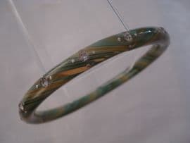 Here we have a nice armlet bangle in a mottled green and yellow swirl colour decorated with sparkly diamante stones and silver pins. This piece of Flapper jewellery would have been worn above the elbow in the roaring 20's and would have been considered most racy and modern. It was probably made in France, where they were particularly good at working early plastics and decorating and inlaying them with glass pastes or diamante and little silver pins. This lovely item is made from the early plastic Celluloid. It has areas of translucent yellow and many shades of green and white - it is quite like some of the naturally-occuring marble and agates with banding. The bangle measures just under 7.5cms in diameter on the inside and is about 1cm thick approximately. It is tubular in shape and would group beautifully with other bangles for a stunning effect which is right in fashion again!