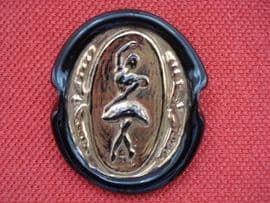 This a genuine Bimini 'Orplid' glass brooch from the 1950's. It features a Ballerina Dancer. The brooch is made from pressed black glass that has been enhanced by gilding. The reverse has a circular brass plaque marked with the Bimini trademark - a little flower pot with leafy shrub and the words 'Hand Made' and 'Made in England'. The pin fastens with an old-fashioned 'c' type clasp. The Bimini story is an interesting one. Austrian Fritz Lampl was a Jew who came to England circa 1938 where he started his glass company in London creating hand-pressed glass.He made mainly buttons and some jewellery often using plaster casts of Roman Coins supplied by the British Museum to create his wares. At one point he employed the young Lucie Rie to create ceramic buttons for his Company. The work was often marked with his trade-mark 'Flower pot' and at first he used the name 'Bimini' but changed this to Orplid. The Company exhibited at the Festival of Britain in 1951 and their work was popular in post-war Britain. Lampl died in 1955 and his Company died with him leaving us a legacy of fabulous, collectable, hand-made glass jewelry and buttons. The brooch for sale would make a great addition to your Bimini collection or a lovely gift for a dancer. the oval shape measures approx 4.5cms in length and is around 4 cms wide with a thickness of approx .5cm. This Vintage costume jewellery item is in very good condition with no chips or cracks or flaws.