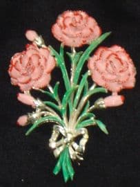 This is a cold enamel Carnation pin by Exquisite Jewellery Ltd., of Solihull, Warwickshire, England. It was one of their range of Birthday Flower Brooches introduced and extremely popular during the 1960's. These pins came in two sizes with a flower for every month of the year! This is the larger sized one! The Company also had a range of Leaf pins and matching earrings, as well as many other lines in quality costume jewellery. The Pink Carnation Brooch is the pin for October . It has a silvery gold tone finish and has the classic "bow" tied around the bunch of flowers which features on all these designer pins. It is in good vintage condition. What a great gift for anyone who has an October Birthday or just because you like it! Approximate measurements are 6.5cms (2.5ins) by 5cms (2ins). This item fastens with a rollover type clasp.