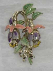 This is a cold enamel Fuschia pin by Exquisite Jewellery Ltd., of Solihull, Warwickshire, England. It was one of their range of Birthday Flower Brooches introduced and extremely popular during the 1960's. These pins came in two sizes with a flower for every month of the year! This is the larger sized one! The Company also had a range of Leaf pins and matching earrings, as well as many other lines in quality costume jewellery. The Fuschia Brooch is the pin for July . It has a silvery gold tone finish and has the classic "bow" tied around the bunch of flowers which features on many of these designer pins. Because these pieces were hand finished, you get marked variations in the colours. This one has the palest tones of a soft grey green on the leaves with a light two-tone soft mauve and pink for the flowers. It is in good vintage condition. What a great gift for anyone who has a July Birthday or just because you like it! Approximate measurements are 6.5cms (2.5ins) by 4cms (1.5ins). This item fastens with a rollover type clasp.