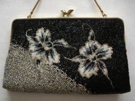 This heavily beaded evening bag is a real gem! It is really encrusted with beads, there must be hundreds and thousands of them on here! Most probably this was made out in Hong Kong, a great centre for beading evening purses and bags. The floral pattern is delightful! It is different on both sides so you can ring the changes with this one. Side one has more black bugle beads than silver and two exotic flowers picked out in blue, black and white seed beads. Turn it over and side two is nearly all silver bugle beads with a tiny corner picked out in black and just one of the exotic flowers. Now we have a choice of styles too. This bag can be used with the handle or without; it will just swing inside completely. You can have an evening bag on a chain or you can have a stylish clutch bag, the choice is yours! Inside it has a black satin lining with a pocket for a mirror. It measures approximately 5.5 inches by a little over 8 inches. This great beaded evening purse has a gilt metal frame which fastens with a 'kissing' type clasp and it has a gold tone 'snake' type handle which is approximately 13 inches in length. This cool vintage bag is in good condition, very smart for a summer wedding and great for evenings out too!