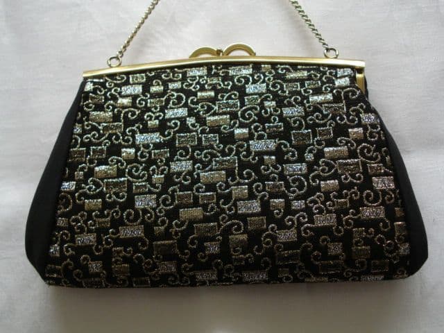 This is a useful evening purse with enough room for all your stuff! It measures approximately 6 by 8.5 inches. It is a plain black fabric with a silver and gold patterned lame fabric panel and the pattern is repeated on the back too. The bag has a plain black watermark type material as the lining and there is a pocket too for a mirror. The frame is gold tone and it fastens with a decorative 'kissing' type clasp in the shape of two half hoops. The chain, which is gold tone aluminium, measures approximately 10 inches in total. This vintage bag is in good condition throughout and is just waiting for you to use it!
