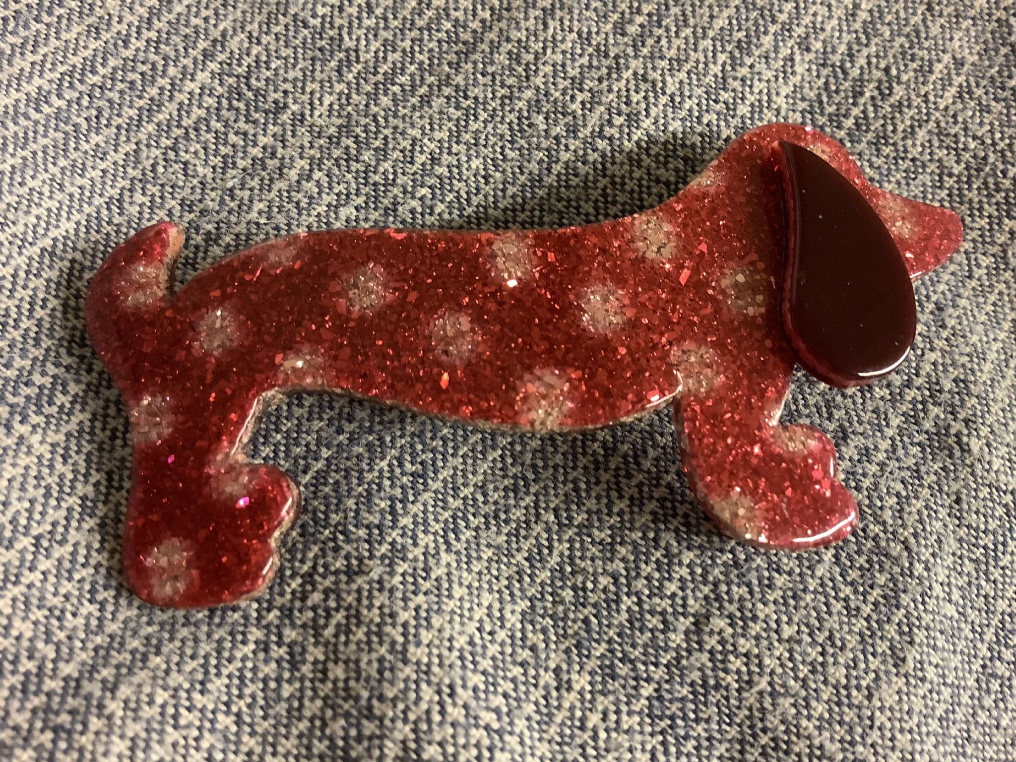 A Red Glitter Silver Spotted Fantasy Dachshund Brooch signed Lea Stein Paris