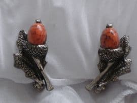 These lovely vintage clip-on earrings are probably by the Celtic Jewellery Company, Miracle, but appear to be unsigned. Each earring is set with a cabochon art glass gem in a speckled orange colour. The metal is a pewter colour with a detailed oak leaf and textured acorn cup. The earrings are in excellent order. Just the kind of earring you should wear in Autumn or 'squirrel' away in your box of hidden jewellery treasures!