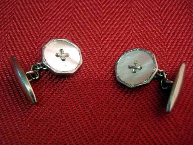 Dating from between about 1915 and 1935 these cufflinks have all the classic style associated with the Art Deco era. The Antique Cufflinks have an Octagon shape on one side with a shiny piece of real mother-of-pearl held in a decorated chromed metal rim with a neat 'cross over' effect in the centre, a little like a stitched-on button. The other side of the link is a shiny chromed metal elongated oval shape and the cufflinks connect on a chain link to the reverse. This design of cufflink is often repeated in waistcoat buttons and collar studs too. Smart and timeless, these cufflinks will do justice to your dinner suit or even formal wedding attire. Approximate measurements for these cuff links are just about half an inch in diameter for the metal edged mother of pearl part and just under three quarters of an inch by one quarter of an inch (at the widest middle part) for the bar back part. The chain that holds the two parts together makes the extended link approx three quarters of an inch from front to back. They come to you in a Black Faux Leather Antique Style Presentation Box with a neat gold 'dot and dash' decoration tooled onto it. The cufflink box has a black velvet and white satin lining and it fastens with a goldtone clip over clasp.