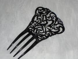 This is a lovely comb with a "lacy" effect . This hair ornament dates from the early 1920's period is made of jet black celluloid by Auguste Bonaz, famous for his wonderful Art Deco Bakelite jewellery. It is signed on the back. It measures 9cms ( 3.6 ins) across and approx 15cms (6 ins) from the tips of the prongs to the top of the comb.