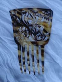 This is a nice faux tortoiseshell haircomb dating from the Edwardian to 1920's period. It has a pierced Art Nouveau design. Measuring approx 12cms (almost 5 inches) tall and approx 8cms (3.5 inches) at its widest point it is still suitable to wear today.