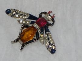 This delightful clip is by the American Company Trifari and is very collectable as it has their famous ' Crown Trifari ' signature mark. This flying insect is set with sparkling white diamante and has a yellow and red glass jewelled body. The piece is finished in Rhodium plate and black cold enamel and is in good vintage condition. The only visable flaw is some loss of cold enamel on one of the bug's knees but he still looks 'the bee's knees' to me! From the tip of his antennae to the tip of foot he measures approx 4.5cms (1.75 ins) whilst his wing span is 5.5cms (just over 2 ins). This 1930's/1940's piece was designed as a collar clip and has just two sharp prong pins on a closing clip to fasten it to the coat or jacket .
