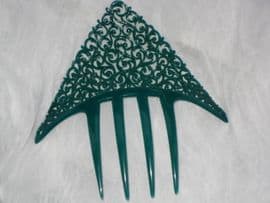 This is an exceptionally lovely haircomb signed by the French designer, August Bonaz, famous for his art deco bakelite jewellery. From around the 1920's this has a swirly lacy pattern and is a slightly different green to the photo. You may just be able to spot the signature in one of the pixs! It is approx 13 cms across (5.2ins) and is some 13.5 cms (5.4ins) from the bottom of the prongs to the tip of the comb.