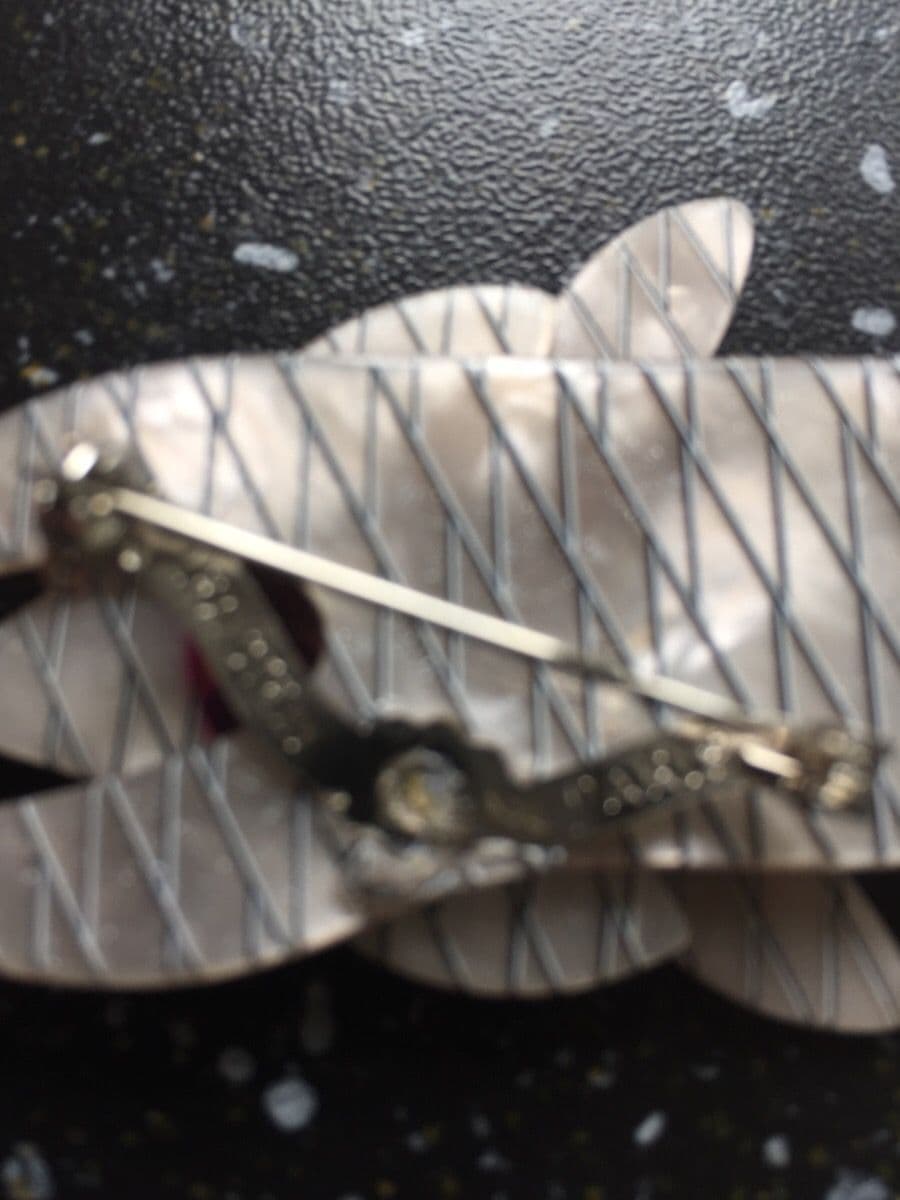 This contemporary Fox brooch measures almost 4 inches by 2.5 inches at its widest parts and has the traditional Lea Stein pin back with a roll-over type fastener. The piece is signed - 'Lea Stein, Paris'. The reverse of this brooch has a silver shiny Pearl effect with diamond patterns made with thin black and white lines. Lea Stein is famed for her jewellery, particularly her animal designs which have featured cats, foxes, dogs, birds and many other things over her history.