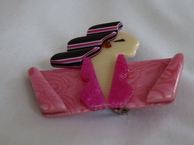 Here we have a fabulous Lea Stein brooch - A Pink Lady Pin! She isn't from the film Grease ( Although Lea Stein has a John Travolta Brooch in her range) but she is said to have been inspired by the actress Joan Crawford and was designed as a tribute to her in 1968. In common with many of Lea Stein's range it goes under another name too so this pin is also known as 'Carmen'. This is a brand new brooch and it is a superb example of the technique used by Lea Stein in her jewellery - it has lots of layers of Rhodoid and the multi layering is used to great effect on the wavy hair on this lady pin. Measuring 5.5 cms by 5 cms at its widest points this brooch uses shades of pink and black with white. The face is in a natural ivory looking colour with a triangular black eye and a super little ball earring which has the effect of natural amber. Lea Stein jewellery has a fascinating history read more here: