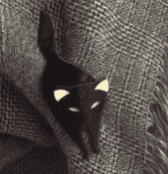 Lea Stein's Cat designs are always so much fun and this one has the added bonus of being a Lucky Black Cat for anyone of a superstitious bent. This Puss has attitude as he has narrow cream eyes and wide spaced ears with ivory cream insets. Is he about to pounce? This Lea Stein cat is a delight and it will add a little bit of fun to any outfit. Cat lovers everywhere have great affection for these brooches. It is probably because Lea Stein has the ability to creat a feline which reminds many people of their own cat. This is a perfect Black Cat with dainty paws and a tail curving slightly up. It really does have character! The light nature of the cellulose acetate and the sensible positioning of the back pin ensures that the brooch will sit extremely well ( without flopping forwards) and that it is suitable to wear on lighter fabric garments as well as the lapel of a winter coat. This gorgeous cat brooch measures 4 inches by 1.75 inches approximately. The pin to the reverse in silver tone, fastens with a secure roll-over type clasp and bears the all important 'Lea Stein Paris' signature. The reverse of the brooch is just like a sweet mint humbug and has black and white striped lines.