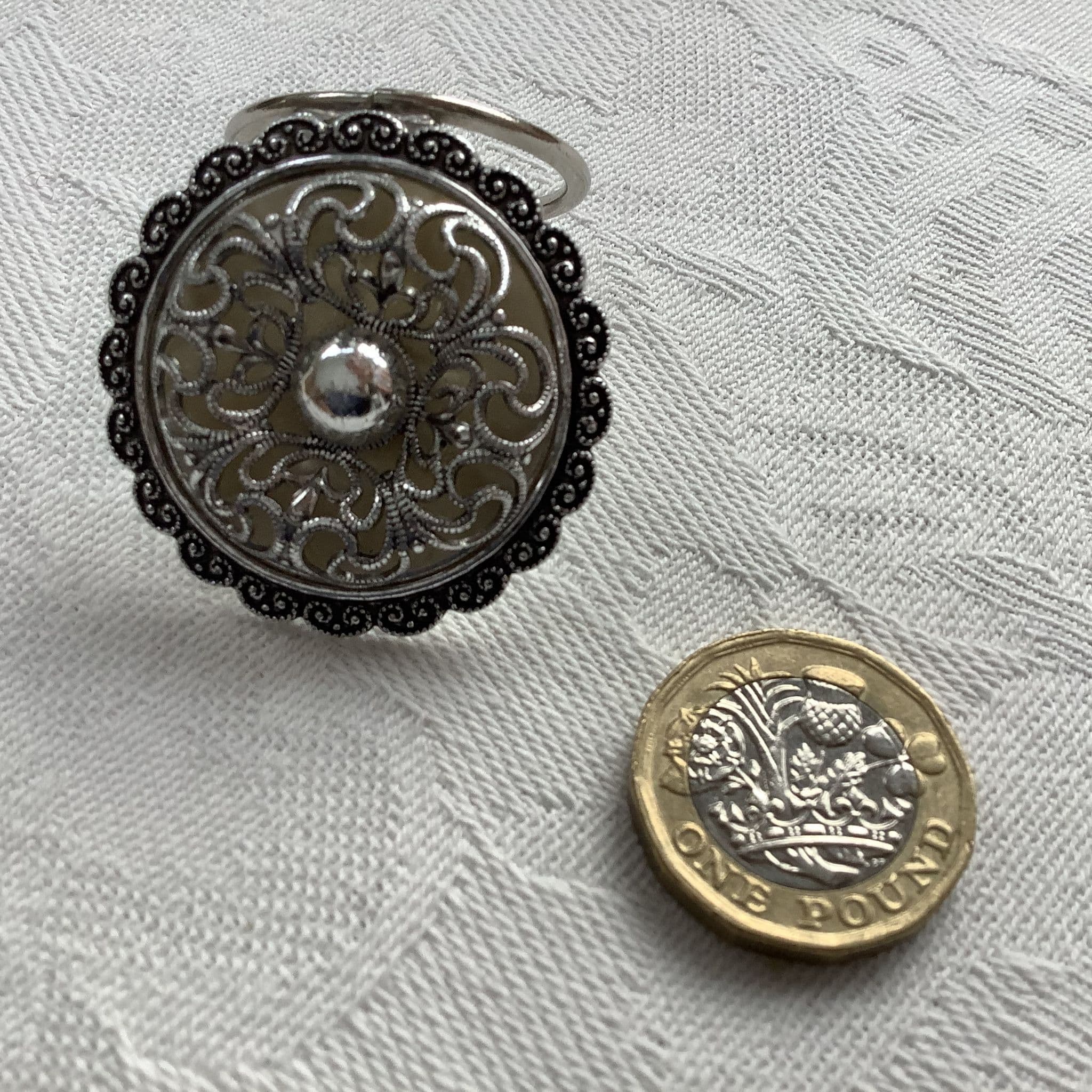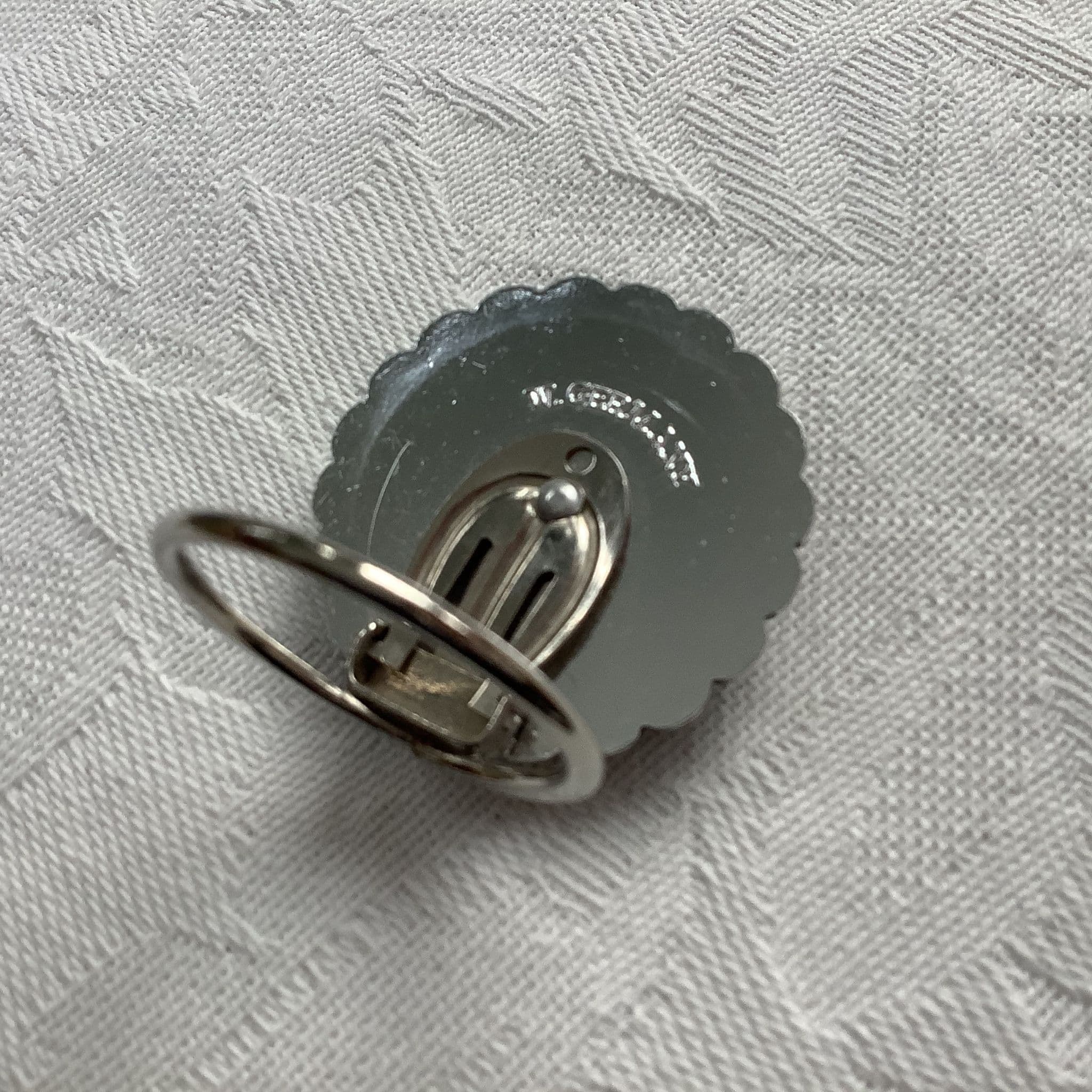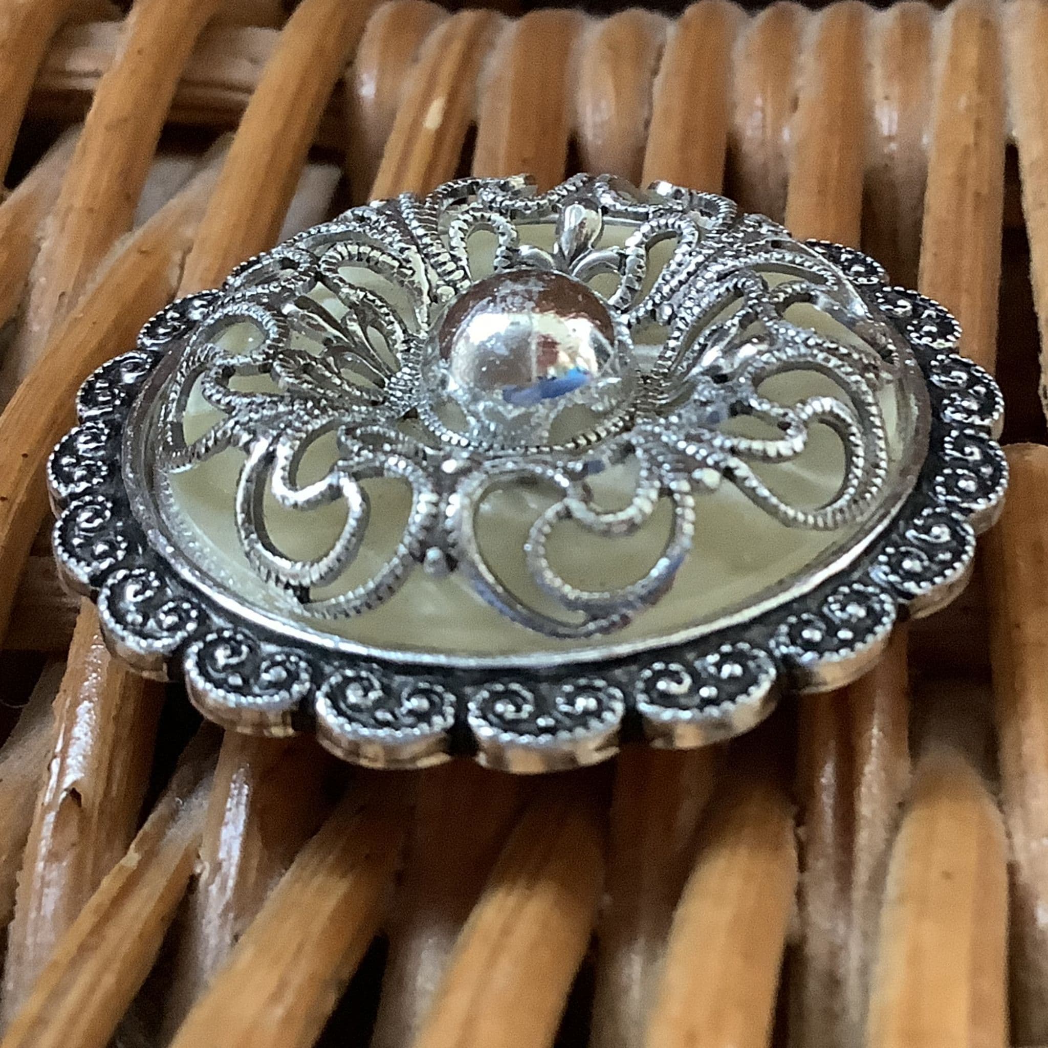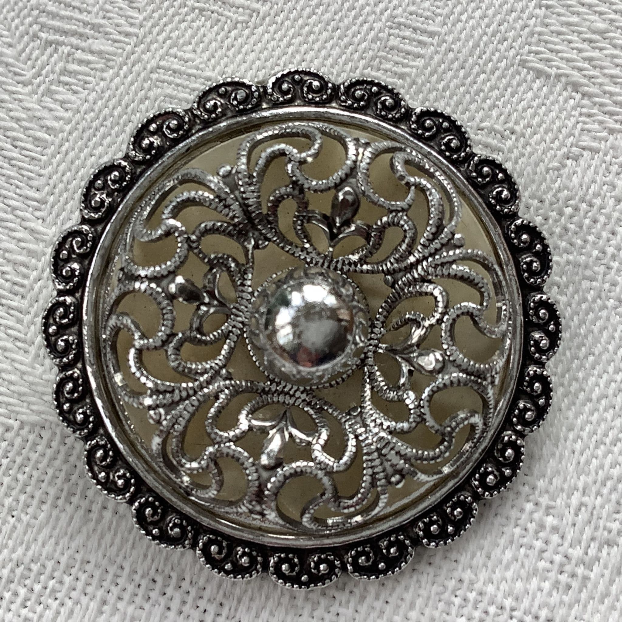 Here we have a very pretty vintage scarf ring in a circular form. The outer edge of the vintage scarf clip consists of a curlicue border and then there is a delicate filigree ring of petals in 3-D like a Daisy type flower. Then there is a panel of creamy pearlised Lucite under this raised flower which looks very like Mother of Pearl. In the centre on top of the mother of pearl effect panel is an open-work silver tone flower. The scarf clip has a ring back and is made of silver tone anodised aluminium which is extremely light so very suitable for the purpose. People always think of Aluminium as a very modern metal but it was first used in jewellery manufacture in the Victorian era and it was commercially in use during the 1860's. Boxes, jewellery and other tiny objects made from it were featured in the Paris Expositon Universelle for the first time in 1855. It also became a popular material for costume jewellery just after World War two and is often found used for necklace chains and bracelets in the late 1940s and early 1950s. This scarf ring has a pearlised plastic inlay which imitates mother of pearl and an elaborately decorated border with a highlighted coloured black background to make the pattern stand out. Measuring almost 1.5 inches in diameter this scarf clip is in very good condition with the clip holding it in place when in use. It is marked W. Germany for West German made.