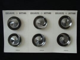 Here are six stylish 'pewter grey' coloured buttons all ready for use or to add to your vintage button collection! The are made from an acrylic plastic. Each has the appearance of a swirl design, yet the button is smooth, flat and shiny. It's a bit of an optical illusion really - very pop art and funky. There are six unused buttons here mounted on original card. It looks like they were designed to be sold in pairs as each two are sewn onto their own section of perforated card with the wording 'EXCLUSIVE BUTTONS' and 'Foreign'. Each button has a diameter of 1.25 inches.