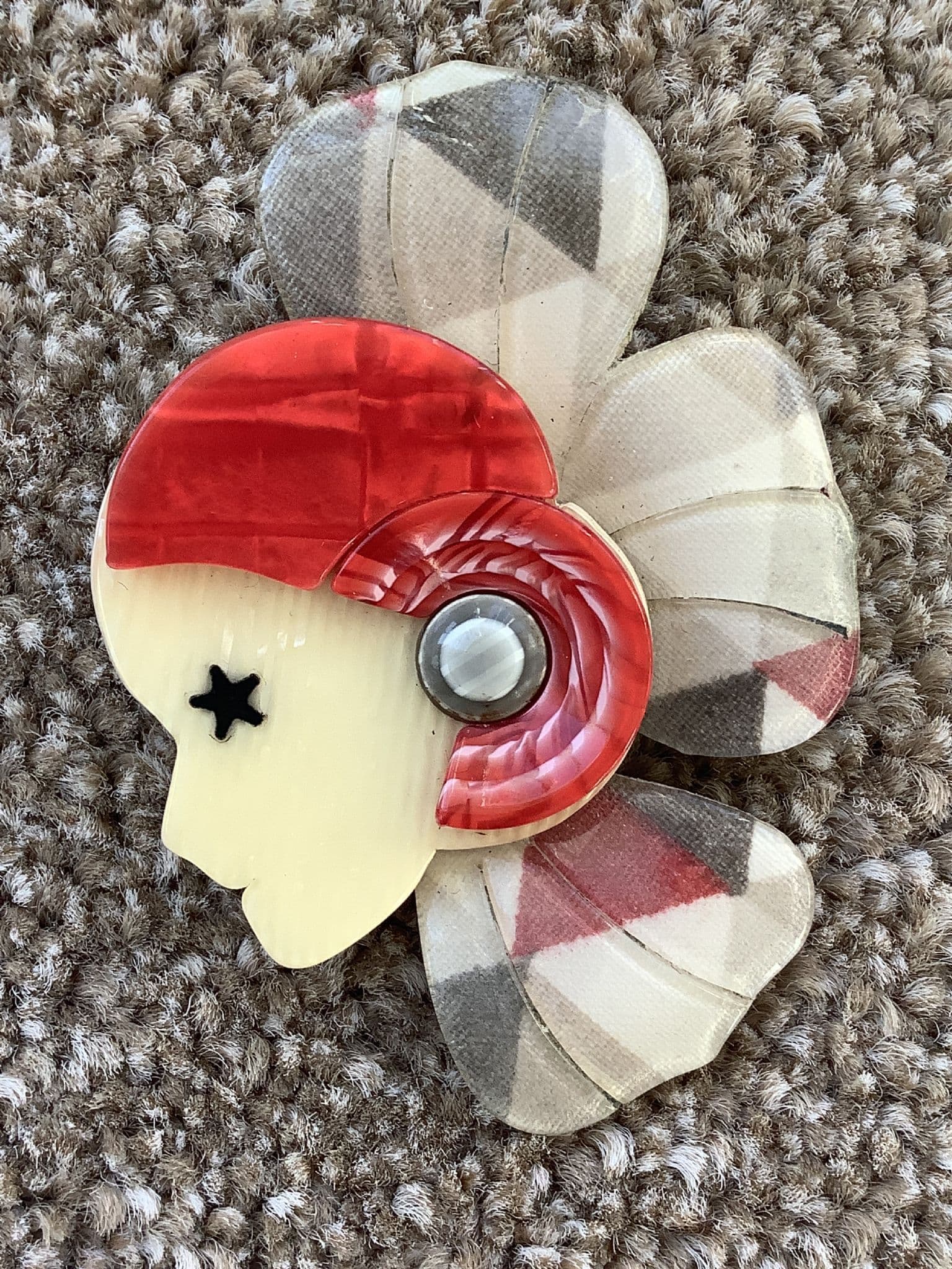 This Flapper girl brooch looks as if she dates from the 1920s but she is a vintage design from the famous Paris jewellery workshop of Lea Stein. Known as 'Corolle' this lady pin has a grey and red triangles collar like a half flower with shaped petal detail. She wears a neat little bathing cap type hat in red with a striped and layered rosette detail of red and white with a grey layered button to the side. Her face is ivory with a black star for her eye. Made from cellulose acetate or rhodoid the pin is very light and easy to wear and will sit well on all fabrics. The reverse of this brooch has a silver tone metal pin with the all important Lea Stein Paris signature and the laminate on the reverse is patterned in black and Ivory. This retro brooch is in excellent condition and measures 6.5 cms by 4.5 cms at its widest points.