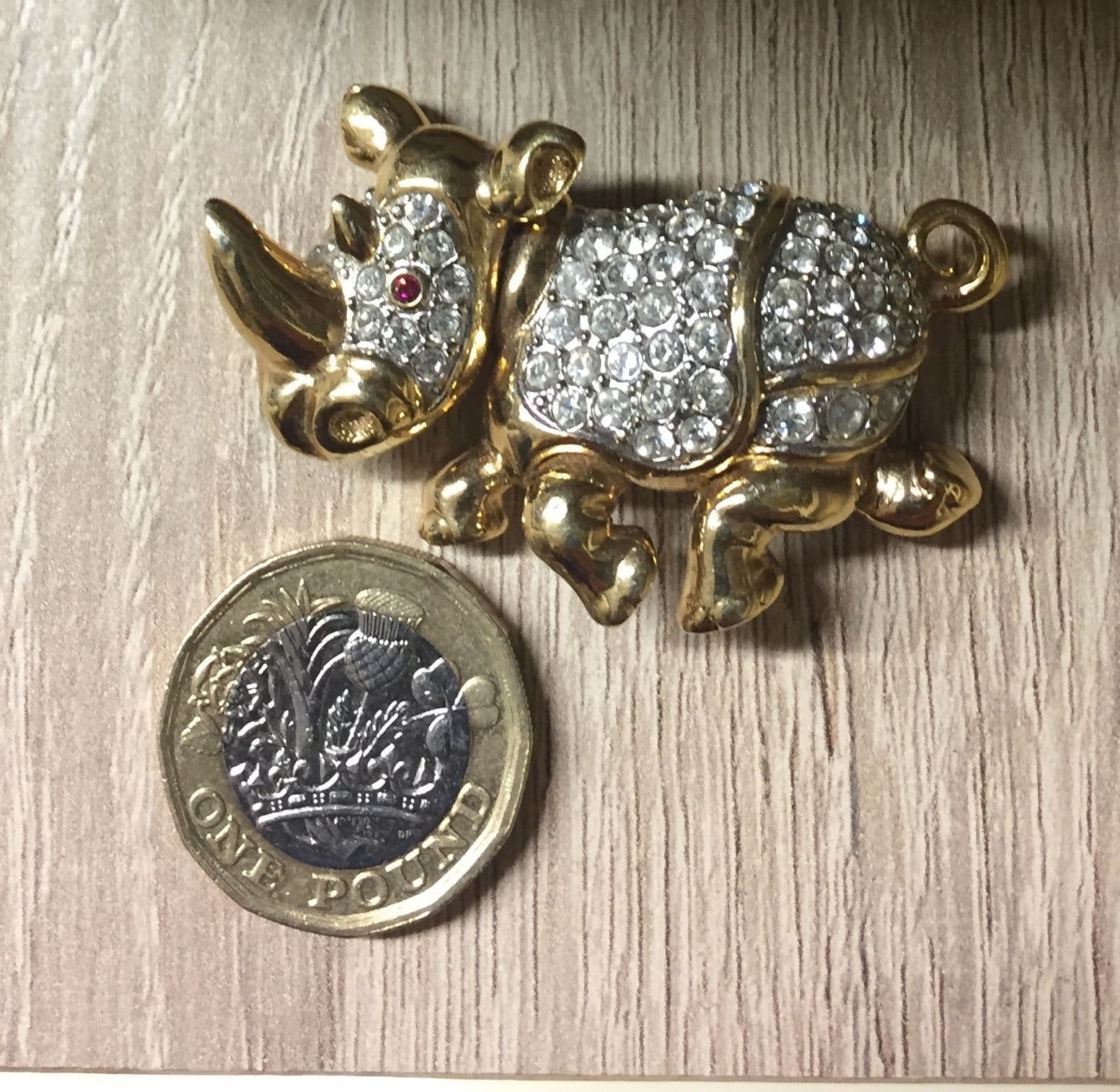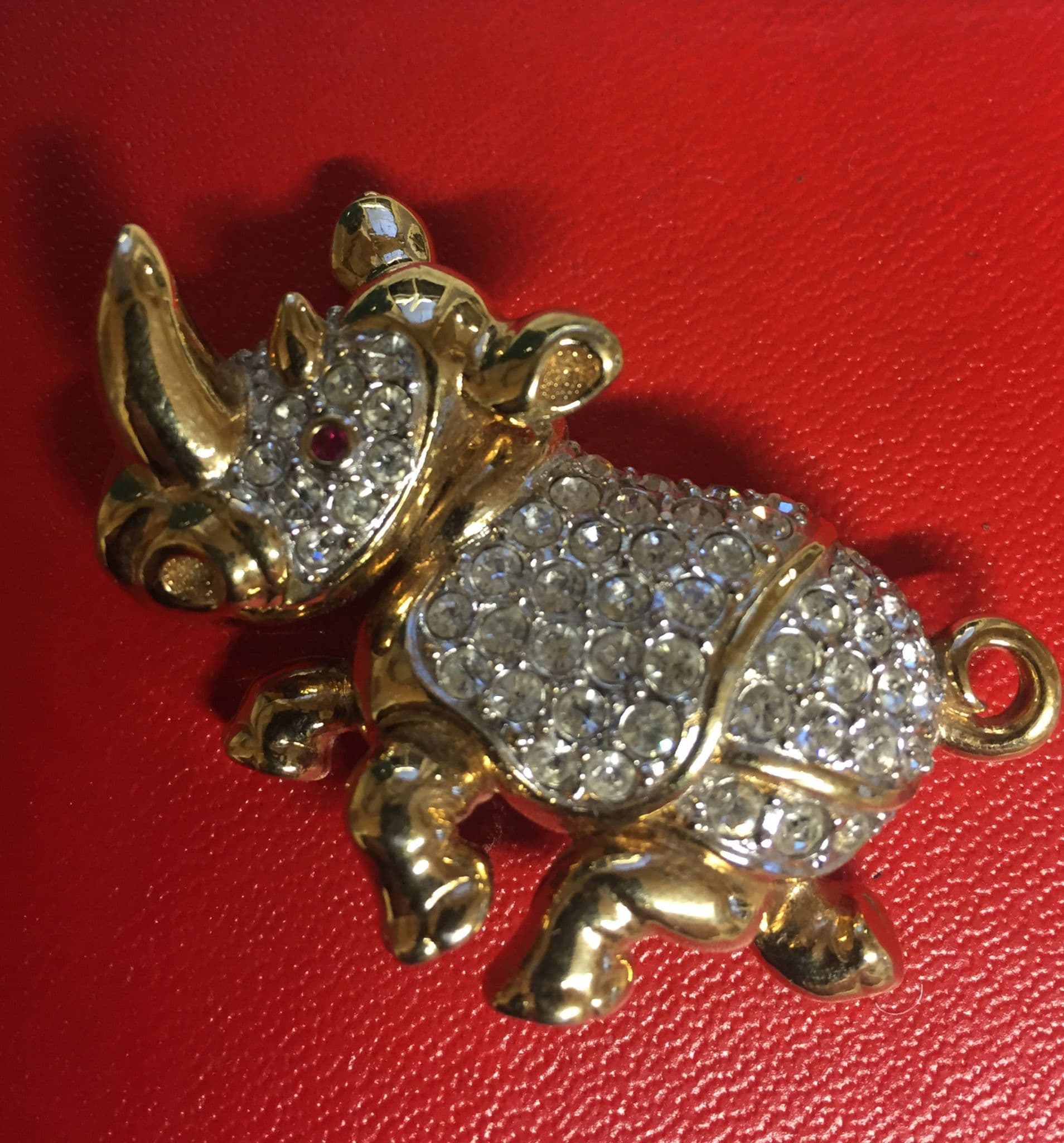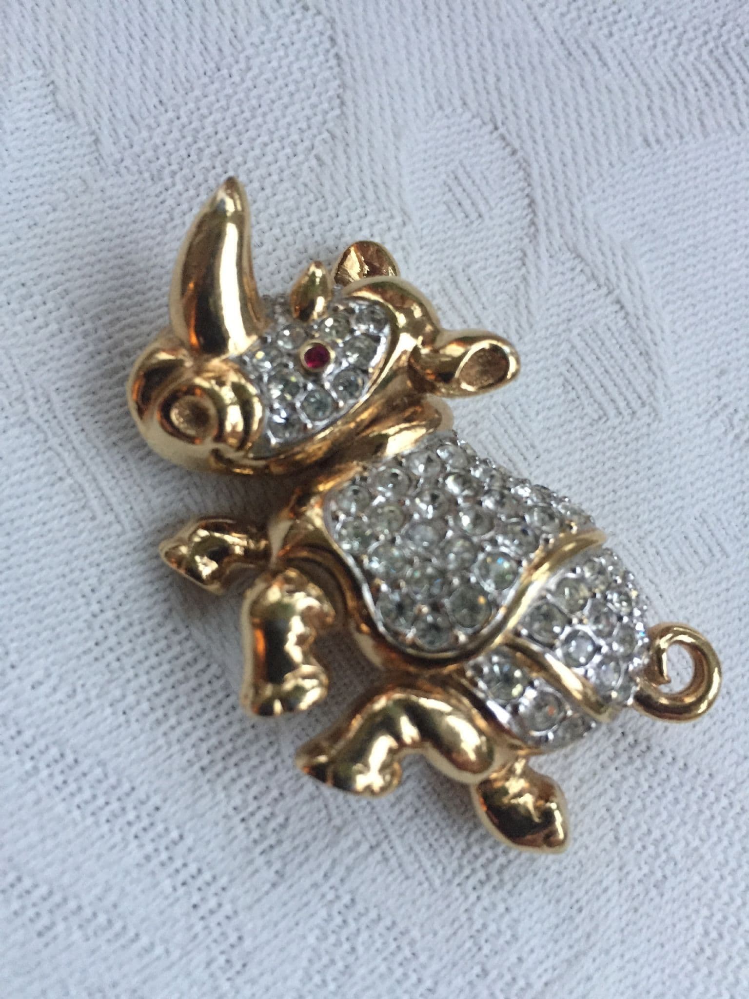 A vintage jewelled Hippo pin is on offer here. The Hippopotamus brooch is from the British jewellery house of Attwood and Sawyer and has the signature "A & S " mark to the reverse. The brooch is gold plated and is set with a myriad of glass crystal diamante jewels. Attwood and Sawyer made fabulous animal and bird jewellery in their ranges and I would estimate that this little fella dates to circa 1980. This Hippo has a cheeky expression and will certainly cheer up any lapel!. The pin to the reverse of the brooch closes in a secure roll-over clasp. Measurements are 5cms by 3cms approx. This collectable vintage brooch is in excellent condition.
