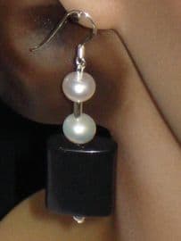 These silver earrings have a touch of the Art Deco style. Featuring ultra-modern black and white in the form of a rectangular pendant stone suspended on silver with freshwater pearls. Drop length approx 4.5 cms (1.5 ins) from the silver earwire.
