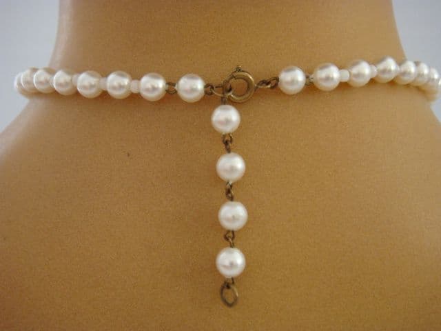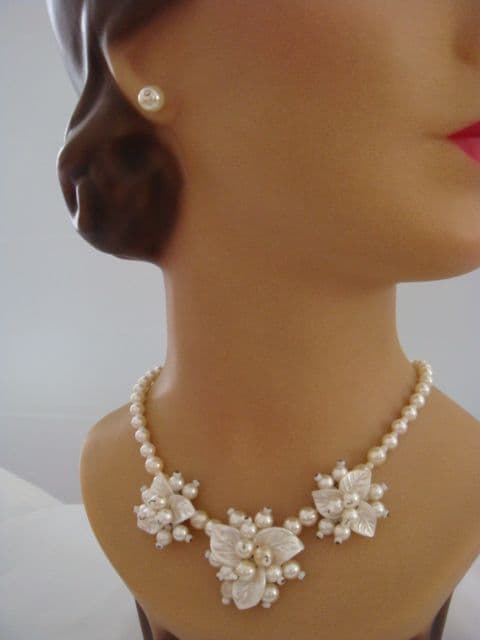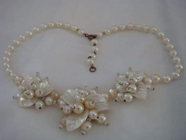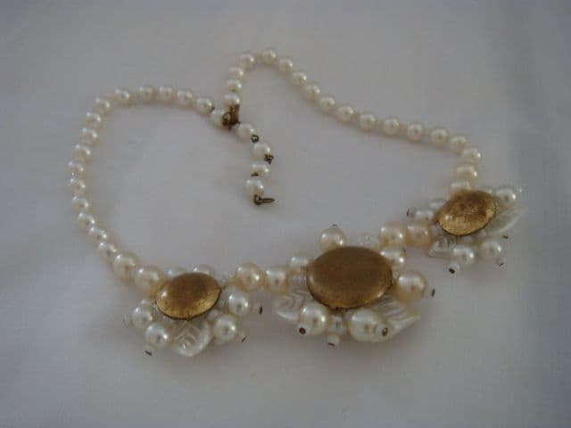 Flowers and Pearls make an ideal choice for a bridal necklace. This vintage necklace, which dates from the 1940s is light, delicate and pretty. It is also in very good condition. This vintage necklace is made from plastic and glass beads that have all been coated with a pearlised material. The necklace has been hand constructed to make three floral clusters and then the faux pearl beads are spaced with little white glass bugle beads. This vintage 1940s necklace measures just 16 inches and there are two points where you can fasten it so it can come up to just 14 inches for a higher look. The largest gorgeous flower centre piece measures about 1.5 inches in diameter and the two either side of it are slightly smaller. Each of the clusters is backed with gilt metal and the clasp too is a gilt metal bolt ring type. There is a line wear to the back metal plates and a little on the pearls but not noticeable really when worn.