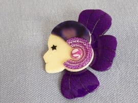 This Flapper girl brooch looks as if she dates from the 1920s but she is a contemporary design from the famous Paris factory of Lea Stein. Originally introduced in the 1980s this is one of the brooches that is in the Art Deco Style. Known as ' Corolle' this lady pin has a gorgeous mauve collar like a half flower and a neat little bathing cap type hat. The hat is marbled shades of purple and black. Her face is ivory with a black star for her eye and sparkly details and a pinky mauve and white button are used to finish the design at the side of her hat. In many shades of purple with black and white this brooch is eye catching. Made from cellulose acetate or rhodoid the pin is very light and easy to wear and will sit well on all fabrics. Thje reverse of this brooch has a silver tone metal pin with the all important Lea Stein Paris signature and the laminate on the reverse is patterned in purple, white and black. This retro brooch is in excellent condition and measures 6.5 cms by 4.5 cms at its widest points.