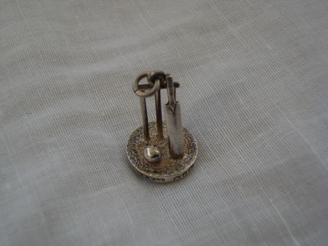 This is a really wonderful fob or seal or charm or miniature piece. It is Victorian Sterling Silver with a full Birmingham Hallmark for 1898, that is a Lion passant, a ' y ' and the Anchor mark. There is also a Maker's mark but this is rubbed and I can't really decipher it all, what I can see are some letters - possibly E.W.I.D or E.W.Ltd? but I can't be sure . A collectable and interesting item for anyone who enjoys Cricket. This charm is a perfect miniature stumps with bail, a cricket bat and ball which is so detailed you can see the stitching! It is just about 1 inch tall with a base diameter of five eighths of an inch round. I think that it was intended to be a seal or fob for a gentleman's pocket watch chain because the bottom has a circle of real Carnelian stone which would have been perfect for engraving with initials or a heraldic seal. There is a little sterling silver ring at the top of the charm which has a lion passant mark on it, again confirming it is sterling silver. The condition is excellent, there is one tiny nibble on the carnelian stone but this in no way detracts from the item.