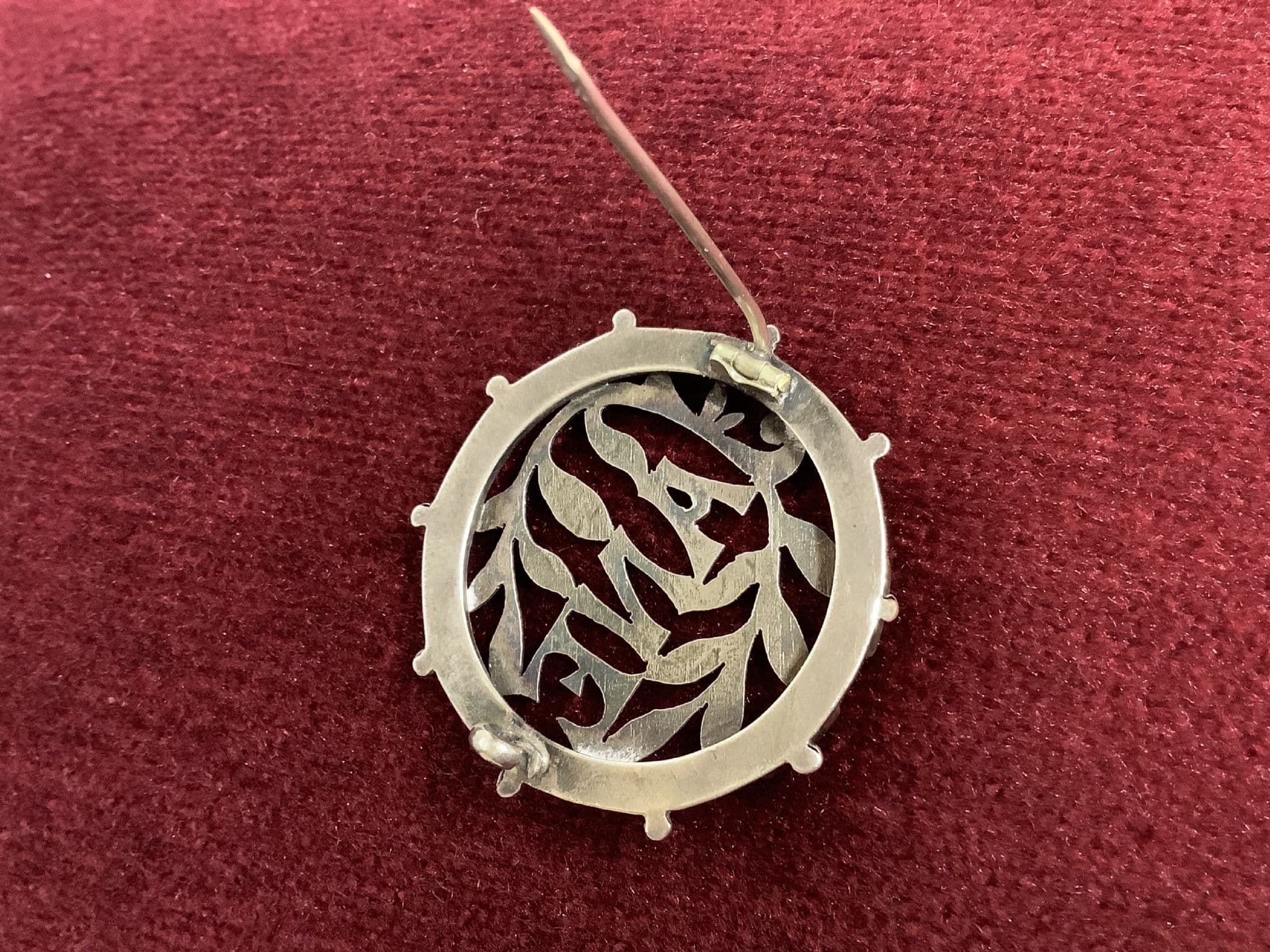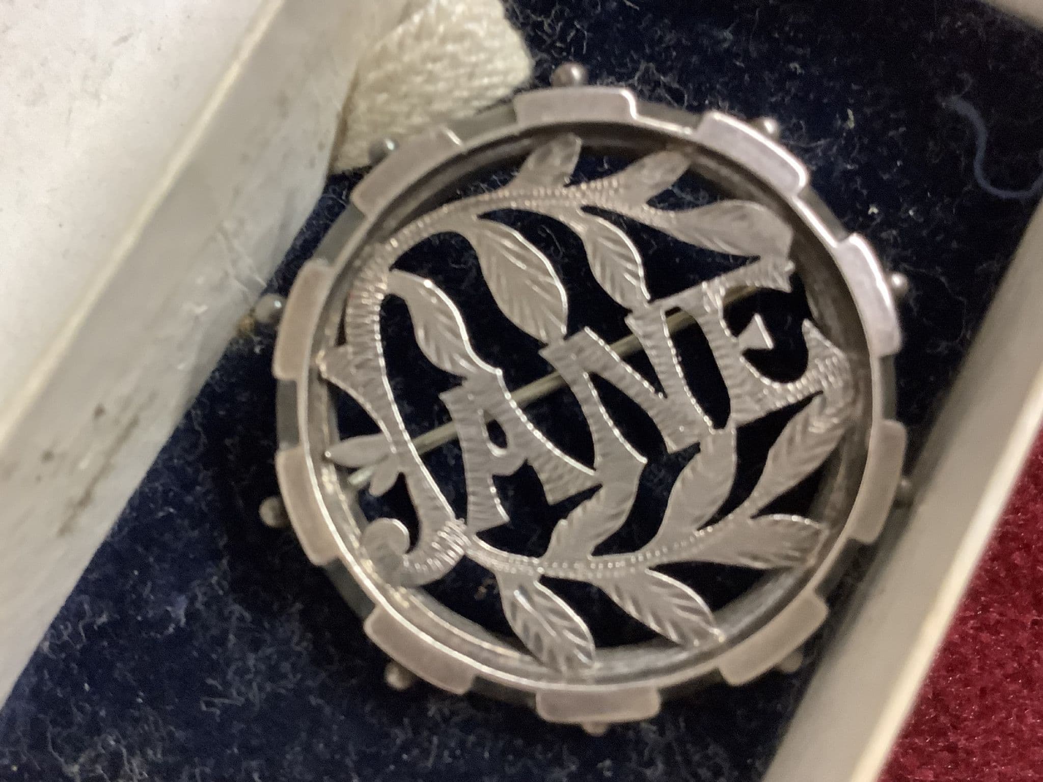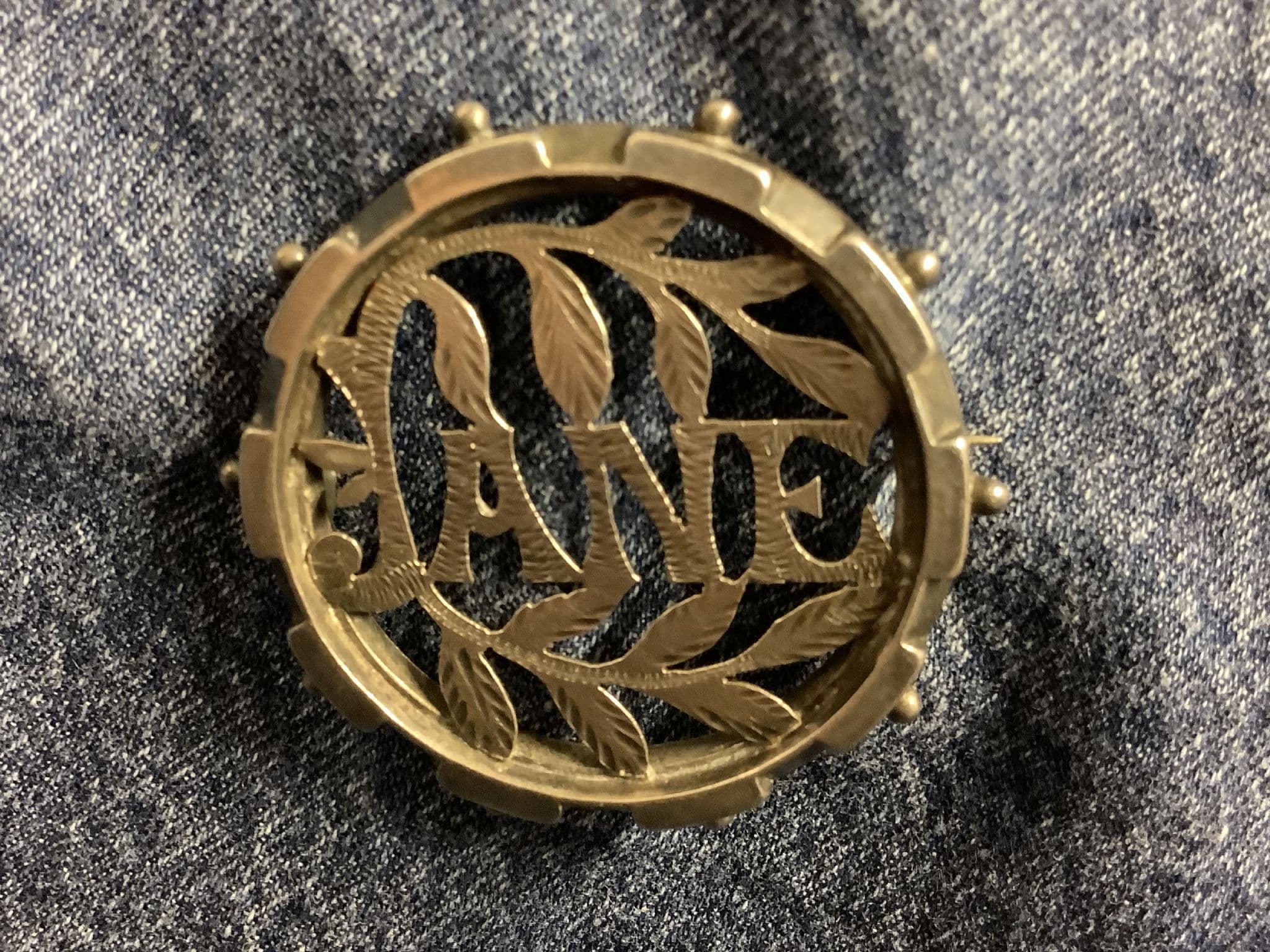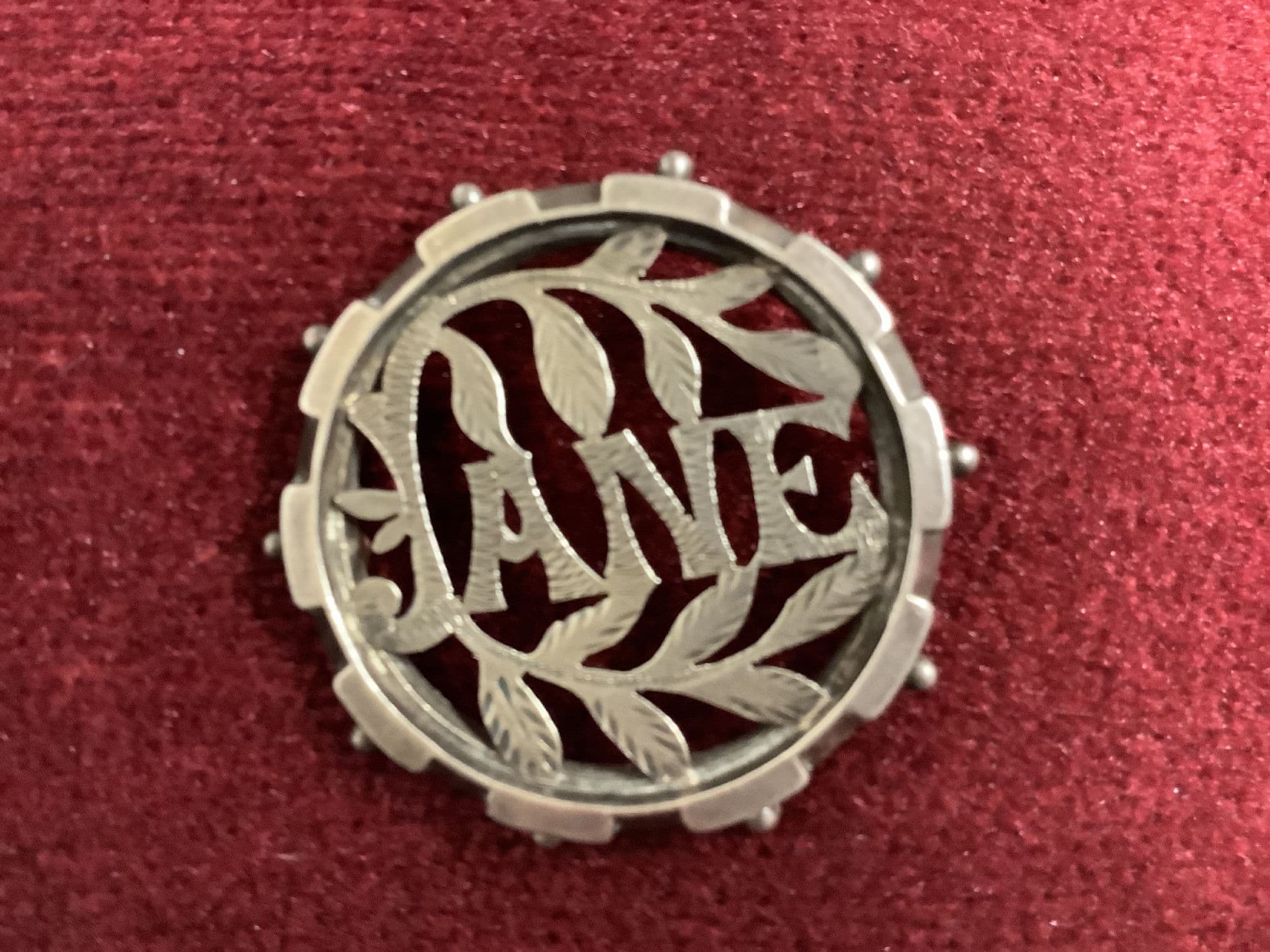 This is a really lovely Victorian Sterling Silver Name Brooch with the name JANE on it. It is not hallmarked but is definitely real silver. The name itself has been cut out and is further decorated with engraving. 'JANE ' is surrounded by cut out foliage and each leaf has the veins traced onto its surface. This antique brooch is typical of the design found in Victorian name brooches of the 1880s and 1890s. It is a round shape with pierced decoration. It has a classical ball decoration around the outer edge and is about the size of on old penny - 3.5cms in diameter. To the reverse you can see the pierced disc has been mounted within the outer frame and like all antique brooches of this period it fastens with a 'c' type clasp and has an extra long pin. This fabulous piece of original Victorian jewellery is in very good condition too. I never overclean antique brooches as collectors often want their Victorian or Edwardian jewellery to look as if it has some age! This would clean up bright and shiny with a silver cleaner if you wanted it to look like new!