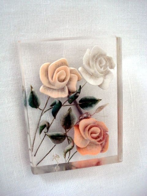This is a really lovely reverse carved Lucite brooch from the 1940's. It is a generous rectangular slab of Lucite in the shape of a book which makes it quite a rare find. Lucite is Dupont's Trade name for their acrylic plastic which they patented in 1936. ICI used the name Perspex for their similar material. In the Jewellery trade the name ' Lucite' is favoured for all acrylic pieces as it was the most widely coined term for American Jewelry. Lucite brooches from the 1930s, 1940's and 1950's are becoming firm favourites with collectors. Just recently a collection of these early plastic pins appeared on the BBC Antiques Roadshow. It is easy to see why they appeal - each one has been hand produced so there are natural variations in the style and design, the material is light making the brooches very easy to wear. The 'see-through' nature of the Lucite makes the brooch take on a different appearance when pinned onto various coloured clothes. This brooch has a white rose, a blush rose and a salmon pink rose stem with moss green leaves. These open roses and leaves are a lilttle bit faded but that only adds to their antique appeal. The carver has popped an initial on the bottom - 'R' which is a lovely touch and is not often seen on brooches of this kind. This vintage brooch measures 2inches by 1.5 inches and is one quarter of an inch in thickness. It is in excellent condition and would make a special gift or would be perfect for collectors of antique and vintage costume jewellery or early bakelite era plastics.