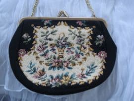 This is a lovely and useful little purse made of machined tapestry with floral decoration. It has one side with a basket of flowers and swags as the design and the other with entwined roses, flowers and a floral bouquet. The main body of the bag is a sort of corded fabric in black with the embroidered panels in cream, gold, shades of green, pinks and purples. It has a very french look to it and is 'tres chic!'. The bag is lined in black satin with a mirror pocket, containing a mirror. The frame is an old gold plated metal with a gold aluminium chain measuring approx 13 inches. It closes with a kissing clasp. The bag itself is approx 4.5 by 6.5 inches with a rounded 'D' shape overall. I would guess it is from the 1960's. This would be lovely to use for evening dress or equally nice for interior design - just hanging on a screen or wall. And because it has a different design on each side, you can ring the changes whenever you want to. It is in great vintage order too!